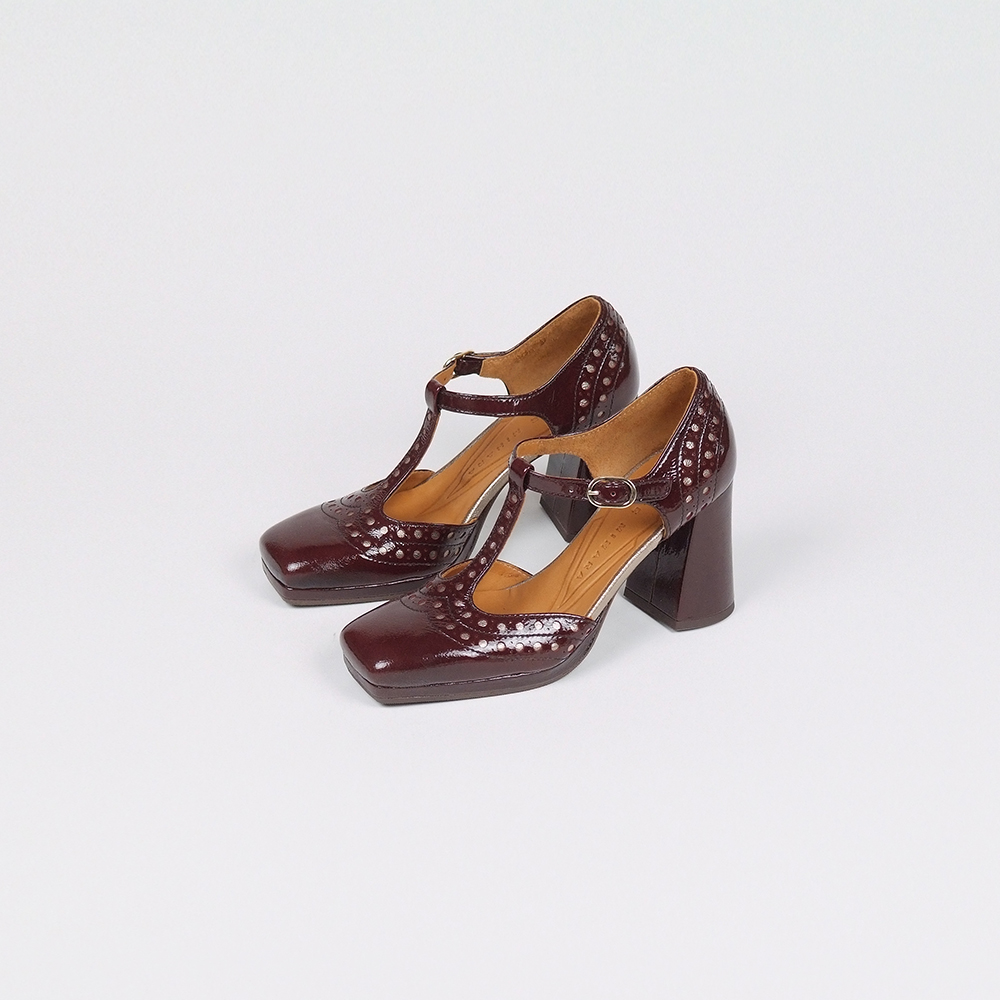 Γόβες Mary Jane T BAR σε καφέ λουστρίνι με τακούνι 7,5cm και εσωτερική πλατφόρμα 1cm.