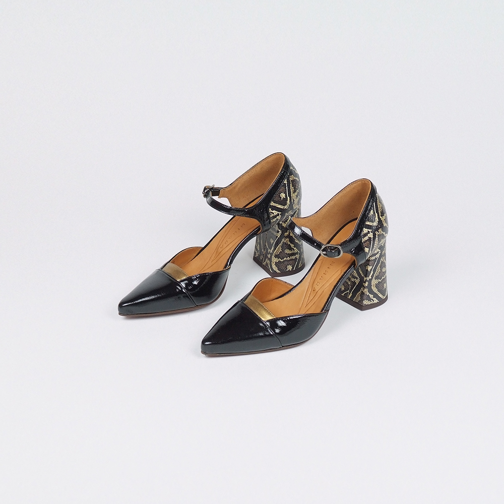 Γόβες δερμάτινες Mary Jane σε μαύρο λουστρίνι με ασπρόμαυρες λεπτομέρειες στο πίσω μέρος και τακούνι 6,5 cm.