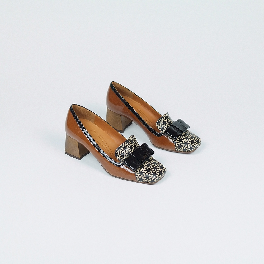 Μοκασίνια δερμάτινα σε ταμπά με μαύρες λεπτομέρειες και τακούνι 5cm