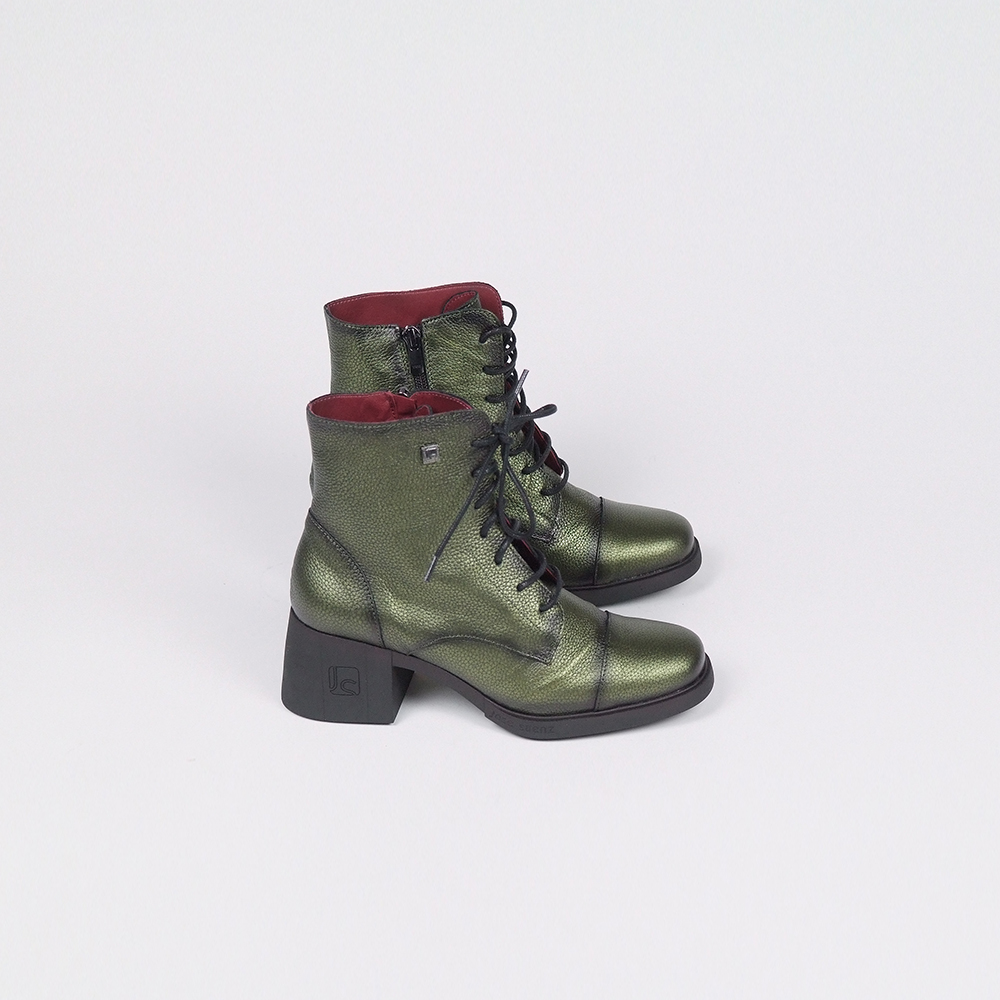 Μποτάκια δερμάτινα σε χακί με κορδόνια και φερμουάρ με σόλα ελαστική και τακούνι 4,5cm.